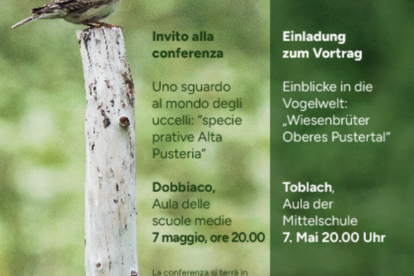 Das Forstinspektorat Welsberg, die Arbeitsgemeinschaft für Vogelkunde und Vogelschutz sowie Ethical Banking laden herzlich zur Infoveranstaltung "Wiesenbrüterschutz im oberen Pustertal". Am Donnerstag, 07. Mai um 18.30 Uhr in Niederdorf und um 20 Uhr in Toblach. Um den Lebensraum der Wiesenbrüter zu sichern, wurde im oberen Pustertal das Wiesenbrüterprojekt gestartet - nach dem Vorbild des ähnlichen Projekts auf der Malser Haide.